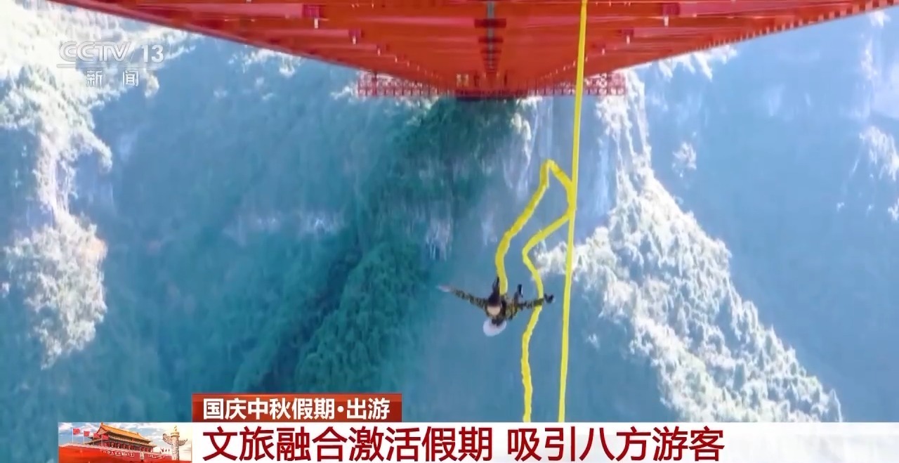 国庆、中秋假期期间,湖南吉首旅游区矮寨奇景十分火爆。高355米的矮寨大桥横跨德夯大峡谷。游客不仅可以体验蹦极、高空秋千等高空极限运动,还可以走进德夯苗寨,在苗族鼓乐的旋律中感受苗族风情。