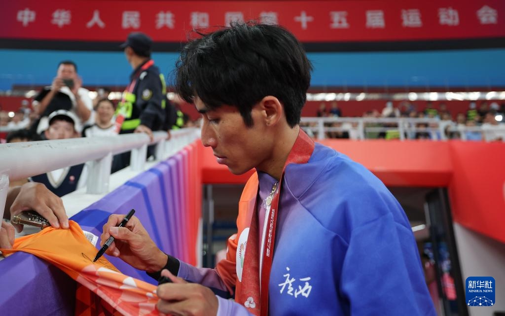 11月16日,广西队亚军刘德树在颁奖典礼后为观众签名。当日,第十五届全运会男子800米田径决赛在广州举行。新华社记者 黄伟 摄 11月16日,亚军广西队选手刘德柱(右)与教练在颁奖仪式上。当日,第十五届全运会男子800米田径决赛在广州举行。新华社记者 黄伟 摄 11月16日,浙江队队内冠军奚晓恒(左)与教练在颁奖仪式上。当日,第十五届全运会男子800米田径决赛在广州举行。新华社记者黄伟摄 11月16日,浙江队球员奚晓恒赛后。最终,他获得了冠军。当日,第十五届全运会男子800米田径决赛在广州举行。照片新华社记者 周牧 11月16日,河南队季军选手马中强(左)与教练在颁奖仪式上。当日,第十五届全运会男子800米田径决赛在广州举行。新华社记者 黄伟 摄 11月16日,浙江队团体冠军奚晓恒(左三)、广西队亚军选手刘德柱(左二)、河南队季军选手马中强(右二)及其教练员在颁奖仪式上。当日,第十五届全运会男子800米田径决赛在广州举行。新华社记者 黄伟 摄 11月16日,广西队球员刘德柱在比赛中。最终,他获得了第二名。当日,第十五届全运会男子800米田径决赛在广州举行。新华社记者 李艺博 摄