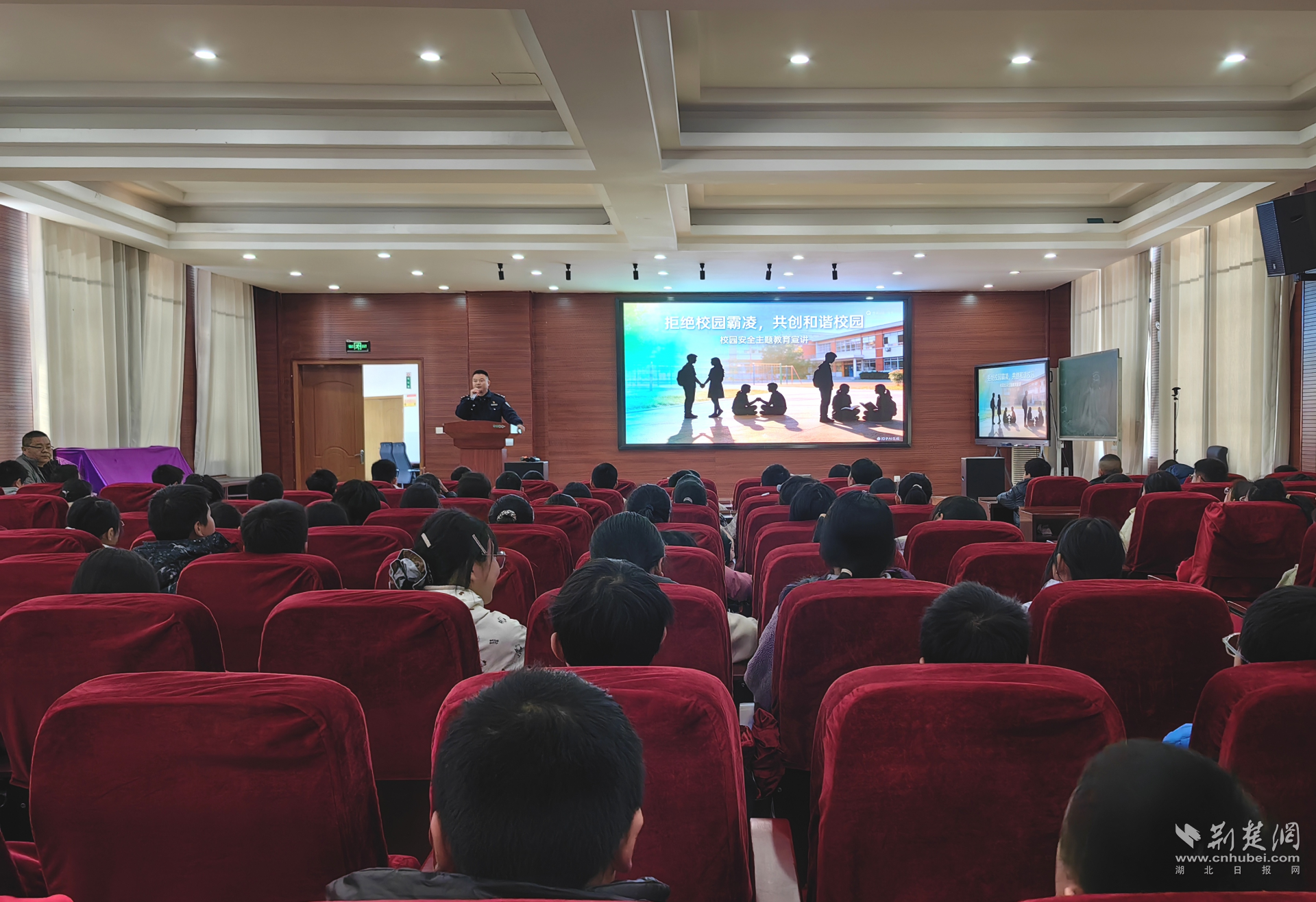 荆楚网(湖北日报网)讯(记者林珊、通讯员张和平、万梦莹)12月25日上午,在江夏区郑店小学报告厅,法治副校长、民警王俊伟来到讲台,为大家带来《创校园的恶霸》法治教育课。